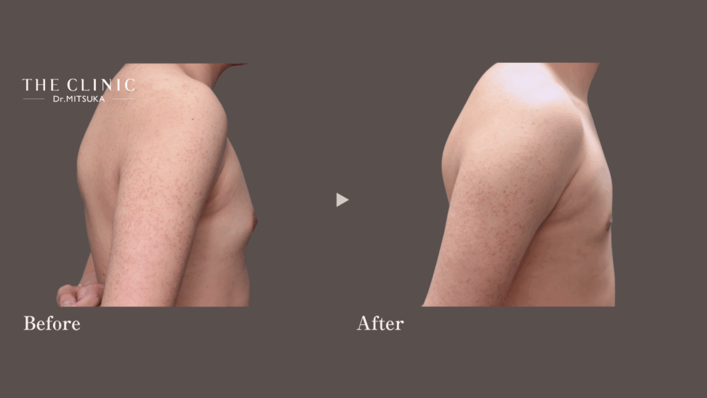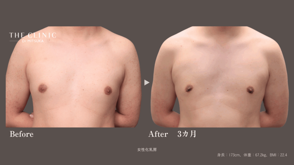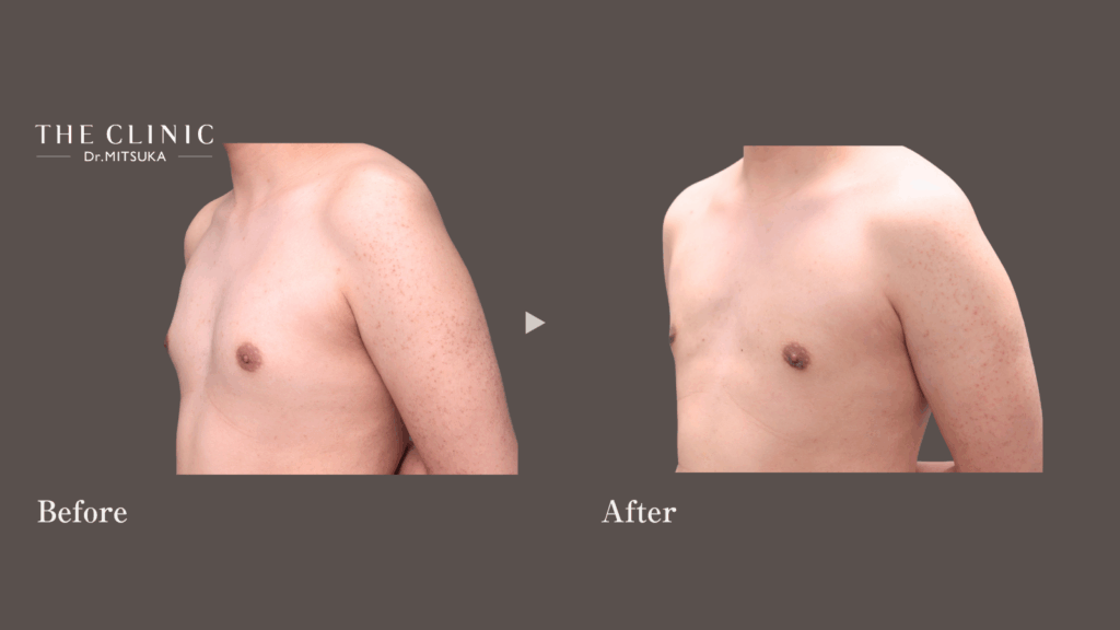 男性でも胸のふくらみが目立つ場合、乳腺の発達による場合と脂肪がメインの場合、その混在という場合があります。今回は脂肪がメインのため、吸引によって綺麗な仕上がりとなりました。